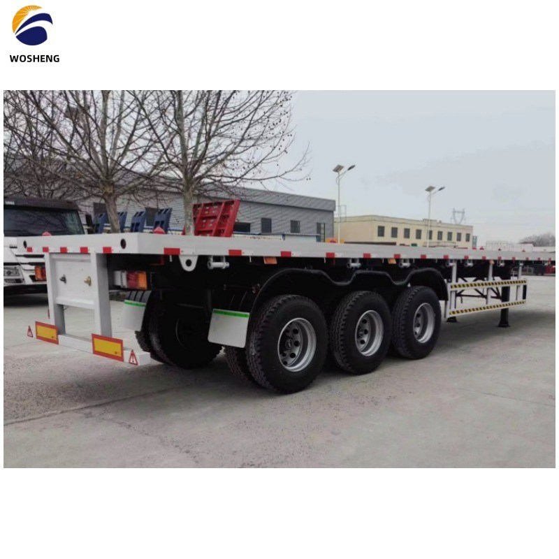1フラットベッドコンテナトレーラーは,私たちの会社の主要製品です.それは高強度フル厚さの鋼で作られています.梁とフレームの強さと強さを保証する最大積載容量:20~100トン